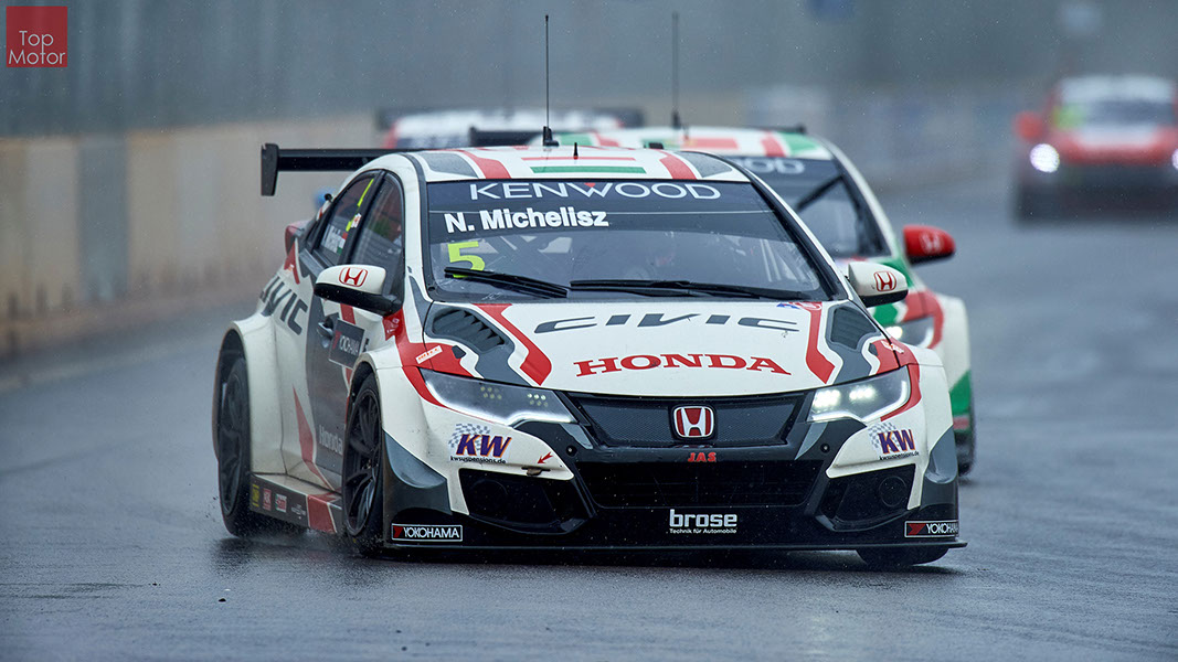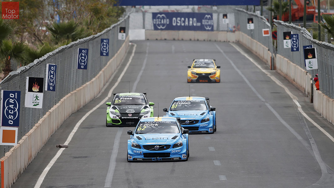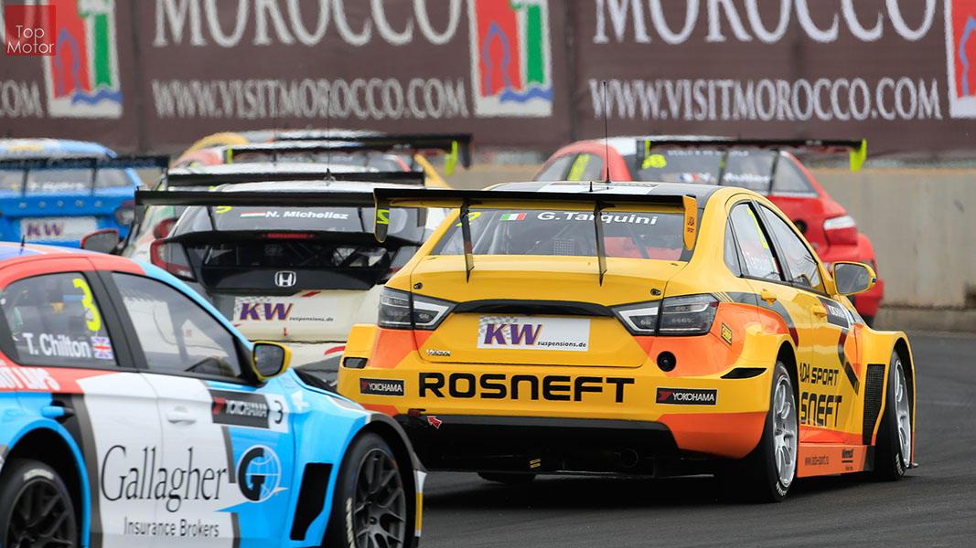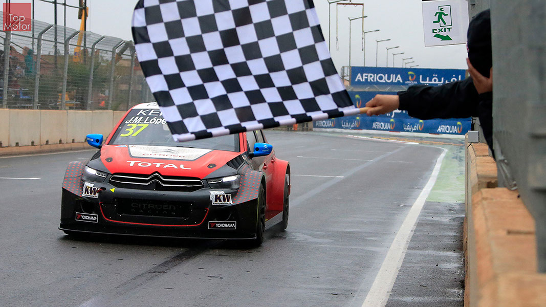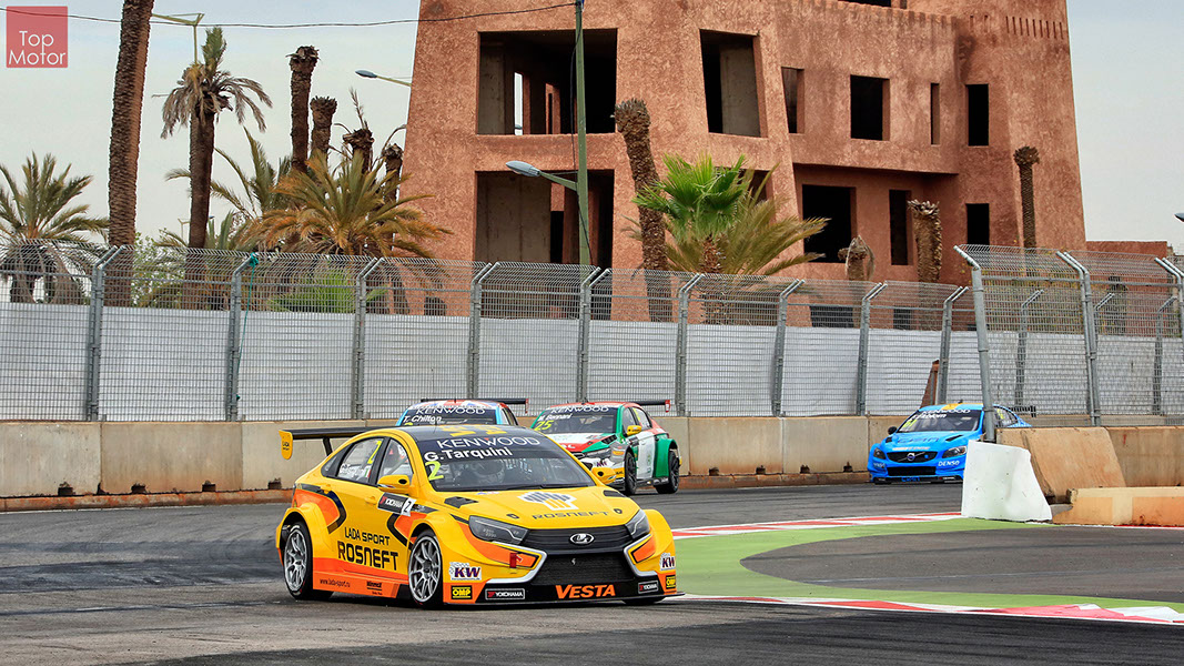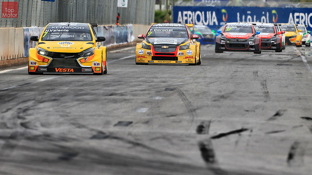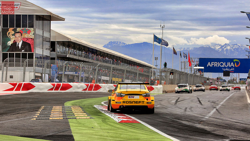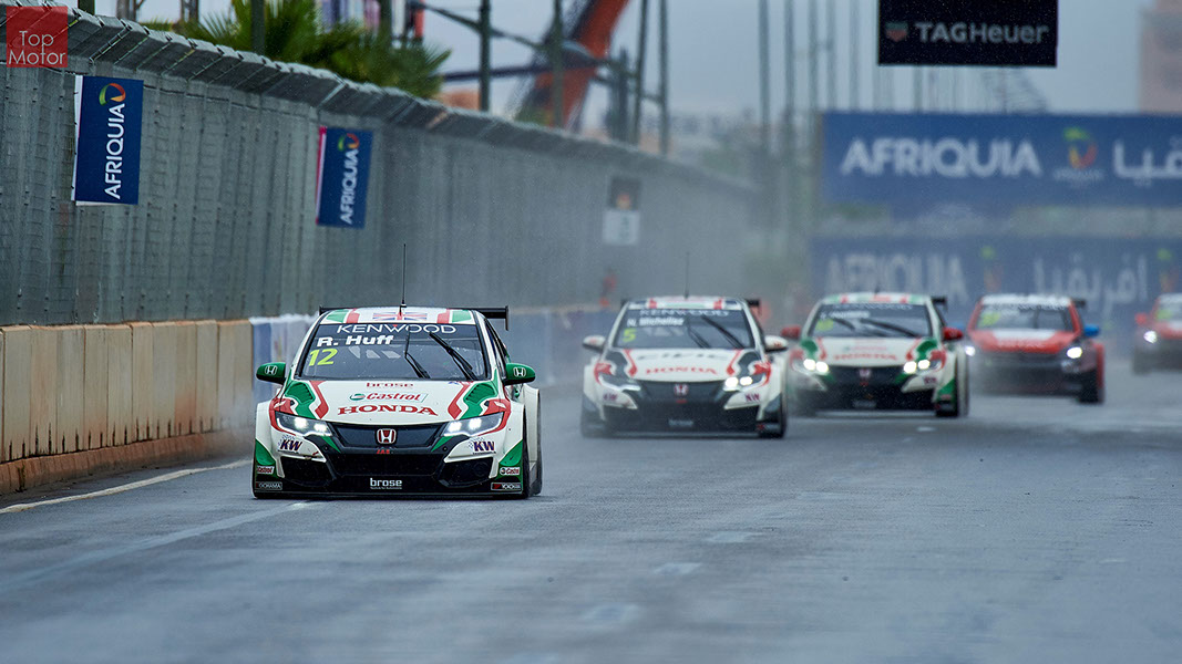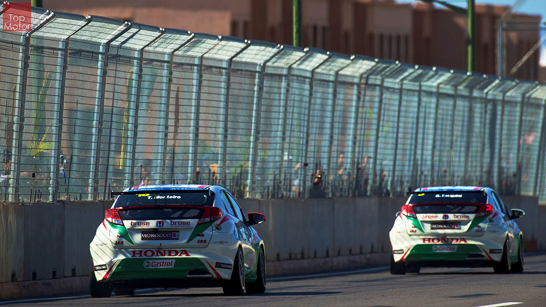 Fotos: © Honda Motor Europe Ltd. / © Citroën Racing / © Lada Sport / © Polestar WTCC - Corrida de Marrocos  A Honda dominou a qualificação da corrida de Marrocos, tendo conseguido os três melhores tempos, com Huff a ser o melhor seguido de Michelisz e Tiago Monteiro. o quarto melhor tempo seria para José-Maria Lopez em Citroën e Nick Catsburg em Lada fechava o top 5. Para a primeira corrida, e pela regra da inversão dos 10 melhores tempos, partia da pole position o Chevrolet de James Thompson, que ao seu lado tinha o Lada de Hugo Valente. Na segunda linha encontravam-se o Volvo de Thed Bjork e o Chevrolet de Tom Coronel. Na terceira linha surgia o Citroën de Yvan Muller e o Lada de Nick Catsberg. José-Maria Lopez e Tiago Monteiro ocupavam a quinta linha, enquanto Michelisz e Huff compunham a sexta linha da grelha. Thompson assumiu a liderança após a partida, seguido por Valente, Coronel e Bjork, mas na curva 3 Thompson sofreu um toque de Valente que o atirou para fora da pista. Na mesma volta também Bjork e Catsburg se envolveram num acidente que os para fora da pista. Hugo Valente assumiu a liderança, seguido por Corornel e Lopez, até ao momento em que recebeu ordem para passar pelas boxes para cumprir uma penalização por ter causado o despiste de Thompson. Coronel assumiu então a liderança seguido de Lopez e Muller, com Monteiro na quarta posição. A partir daqui a corrida pautou-se por Coronel a tentar defender-se de Lopez até ao final da corrida, num circuito onde não é fácil ultrapassar. No final Coronel saiu vencedor, Lopez foi segundo, Muller terceiro, Tiago Monteiro foi quarto e Michelisz fechou o top 5. Para a corrida principal a ser disputada debaixo de chuva, a grelha de partida já era constituída pela ordem dos tempos de qualificação com os três Honda a saírem das três primeiras posições, seguidos pelos dois Citroën da equipe oficial. Os Honda arrancaram bem conseguindo manter as suas posições, no entanto, Tiago Monteiro viria a ser ultrapassado por José-Maria Lopez ainda durante a primeira volta. O piloto português não baixou os braços e continuou a pressionar o argentino, tendo conseguido recuperar a terceira posição na quinta volta após um erro de Lopez que o forçou a fazer uma trajectória de curva mais larga aproveitando Monteiro para o ultrapassar. Daqui em diante a luta pelos lugares dianteiros tornou-se algo desinteressante com os pilotos mais preocupados em assegurar os lugares e a garantir os pontos, não arriscando muito devido ao piso molhado, estando no entanto Lopez sempre à espreita de uma oportunidade de atacar Monteiro, tendo intensificado as suas tentativas nas voltas finais. As disputas mais interessantes centraram-se nos restantes lugares pontuáveis. A corrida terminou com a Honda a conseguir fazer o 1,2,3 com Huff na primeira posição, Michelisz na segunda e tiago Monteiro a garantir o terceiro lugar do pódio. Lopez terminou e quarto e Muller fechou o top 5.