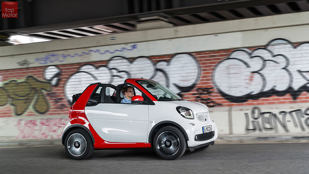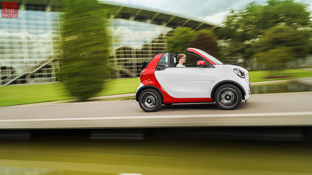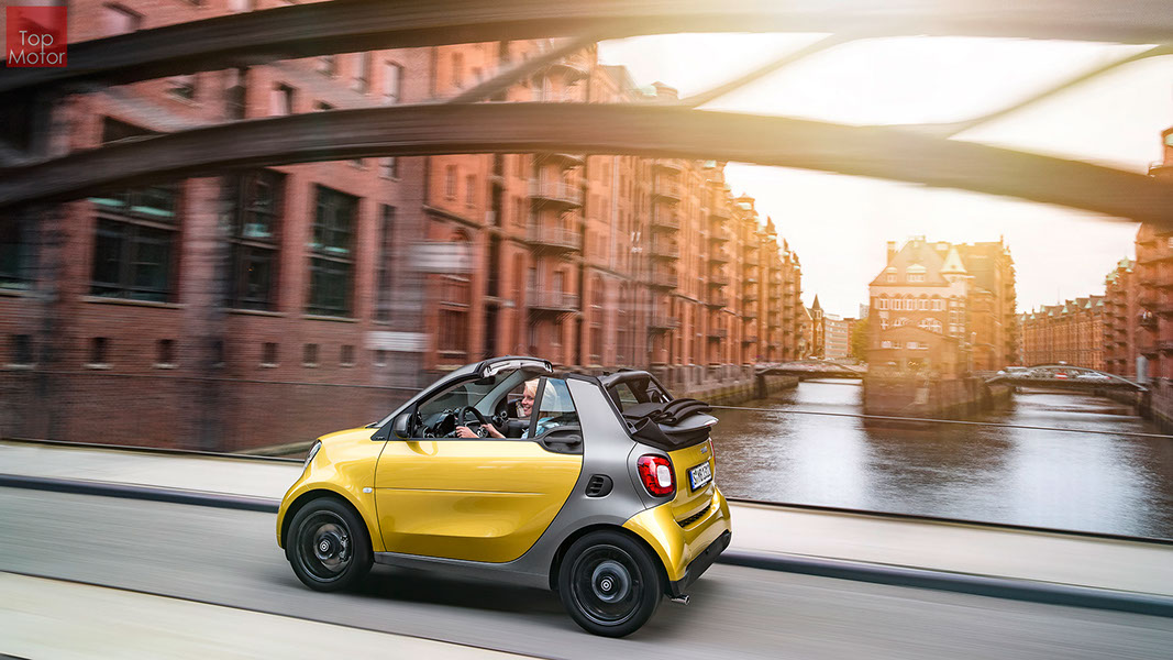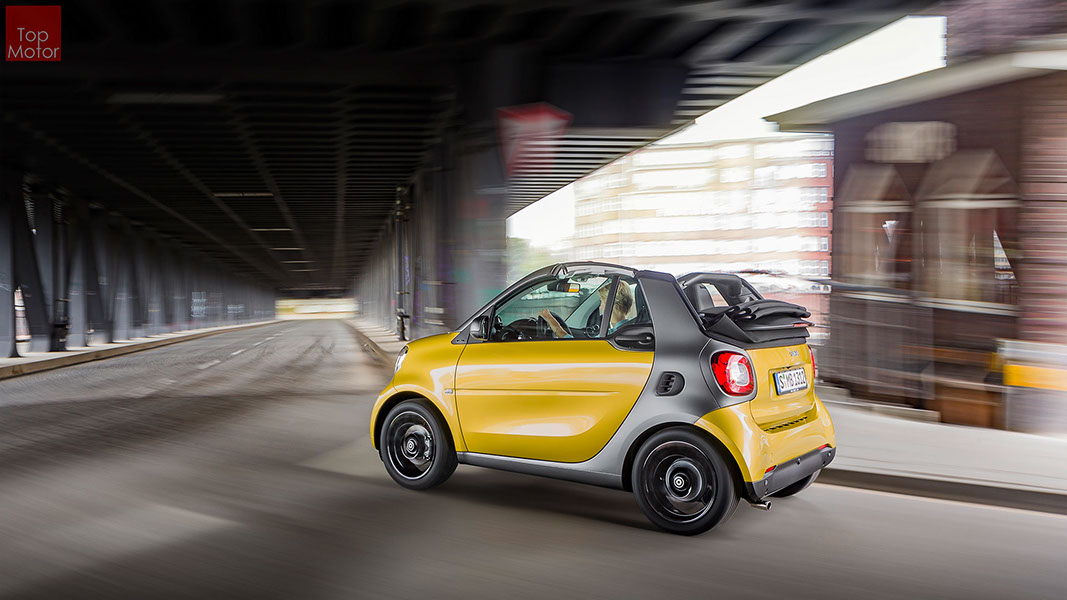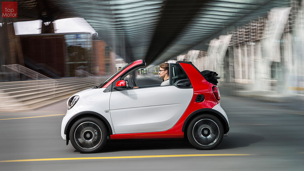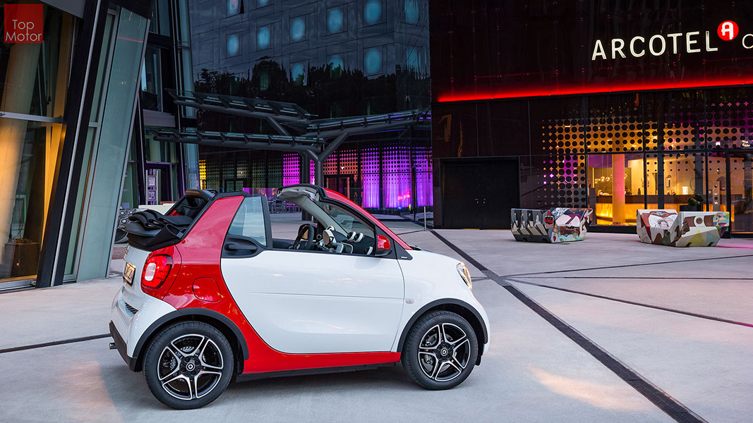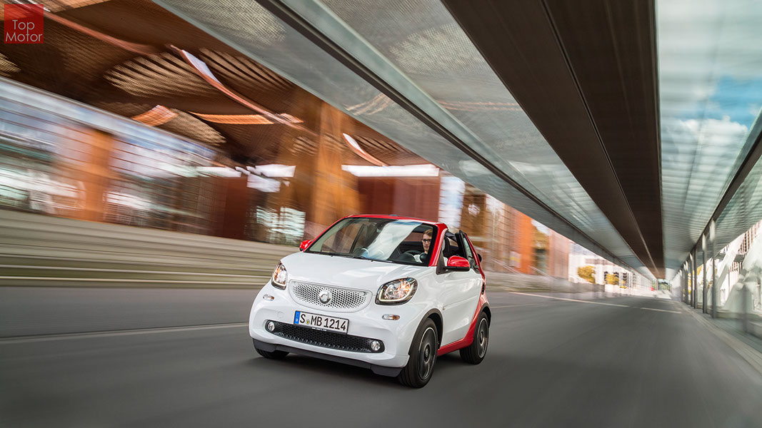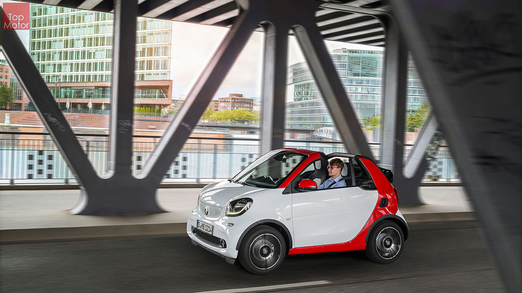 Fotos © Daimler AG Smart Fortwo Cabrio  3 em 1! Esta é provavelmente a melhor forma de descrever o novo Smart Fortwo Cabrio, pois o pequeno citadino de 2 lugares, tanto pode ser utilizado como um pequeno coupe fechado, pode apenas abrir o seu enorme tecto deslizaste ou transforma-lo num verdadeiro cabrio com a capota totalmente recolhida, podendo assim adaptar-se as diferentes condições atmosféricas ou aos diferentes estado de espírito do seu condutor. O novo Smart Cabrio é logo reconhecido como menbro da nova geração Smart, pois o se designe é em tudo igual à versão fechada, com a excepção do pilar B que é mais estreito no cabrio. São apenas necessários 12 segundos para abrir a capota "Soft Top", abertura que pode ser feita em modo totalmente automático e mesmo quando se circula à velocidade máxima, podendo também ser aberta desde o exterior do veiculo através do comando remoto. Para transformar o pequeno Smart num verdadeiro cabrio, é necessário remover manualmente as barras laterais do tecto, as quais podem depois ser guardadas num pequeno compartimento, próprio para o efeito, situado na porta da bagageira, que oferece ainda espaço adicional de arrumação, onde é possivel armazenar pequenos objectos, como por exemplo, o colete reflector, o triângulo ou o kit de primeiros socorros. A capota tem uma área total de 1.8m2, sendo que é cerca de 4% maior que a do seu antecessor, e é composta por 3 camadas. Uma camada exterior de tecido poliacrilico, uma camada interior feita numa mistura de algodão e poliester e no meio uma camada de borracha. No total a capota tem uma espessura de 20mm e o óculo traseiro é de vidro e aquecido. A resistência torcional da carroçaria foi melhorada em cerca de 15% relativamente à versão anterior, recorrendo a diversos materiais. Comparativamente ao coupe, foi ainda reforçado em locais específicos de modo a oferecer uma maior resistência da carroçaria. Para além de uma ampla utilização de aço na parte inferior, os pilares A, foram também reforçados com a introdução de um tubo em aço no seu interior. Ao nível da segurança dos ocupantes, esta é sobretudo assegurada pela tradicional "Safety Cell" da marca, capaz de absorver grandes quantidades de energia provocada pelos impactos, e de forma a satisfazer os critérios cada vez mais exigentes das normas de segurança dos crashtest, o Smart Cabrio foi também sujeito ao teste "Roof-Drop" (queda sob o tejadilho) da Mercedes, que consiste em deixar cair o veiculo num determinado ângulo, de uma altura de 50 cm sob o tecto atingindo um dos pilares A. como auxiliares à segurança o Smart conta aida com alguns sistemas até aqui reservados a classes superiores, como o ESP de ultima geração com Crosswinds Assist (assistente de ventos laterais) e o Hill Start (assistente de arranque em subida) ambos de série, e como opcionais o alerta de colisão com o veiculo da frente ou o assistente de transposição da faixa de rodagem. Em termos de motores de inicio vão estar disponíveis duas motorizações a gasolina ambas de 3 cilindros e com 71 e 90 cv, e ambos com a opção da caixa manual de 5 velocidades ou automática de dupla embraiagem. Para além dos equipamentos base das 3 versões disponíveis, Passion; Prime e Proxy, existe um vasto leque de opcionais com vista a melhorar a segurança e o conforto. O novo Smart Cabrio promete assim proporcionar o verdadeiro Joie de Vivre aos seus utilizadores.