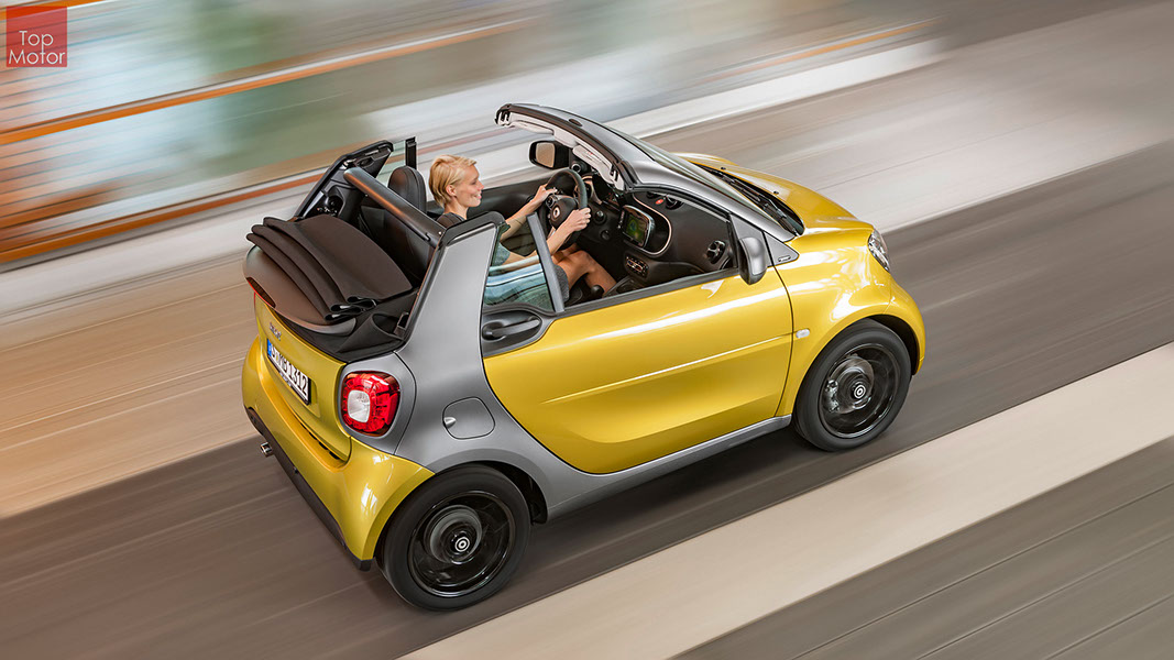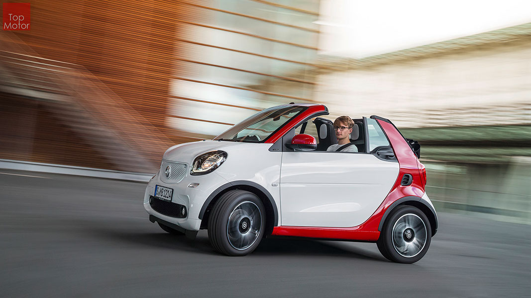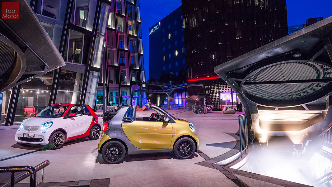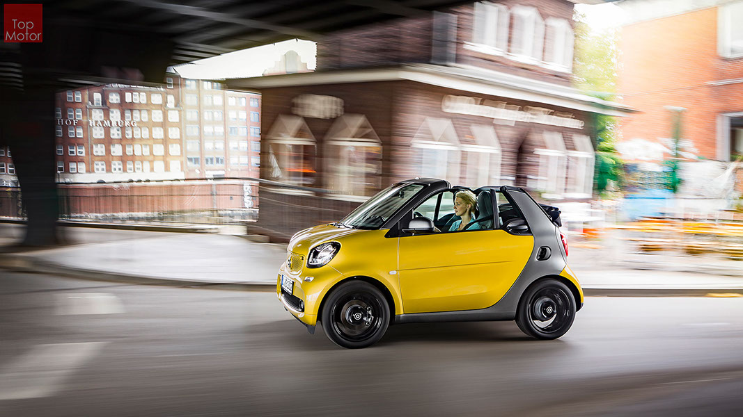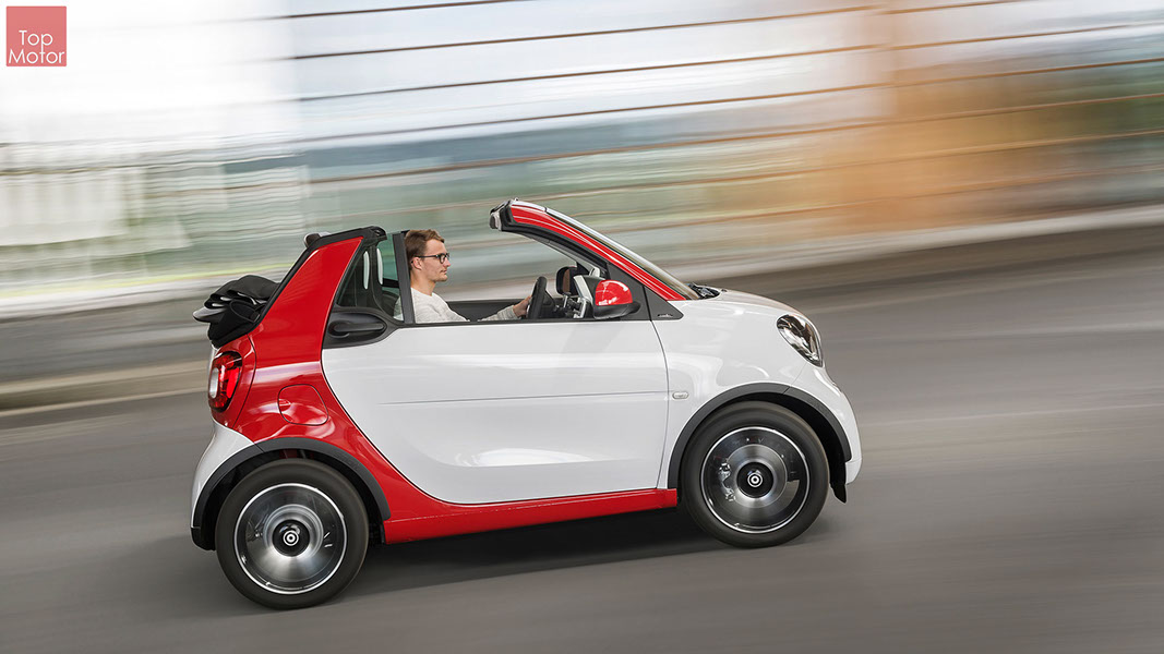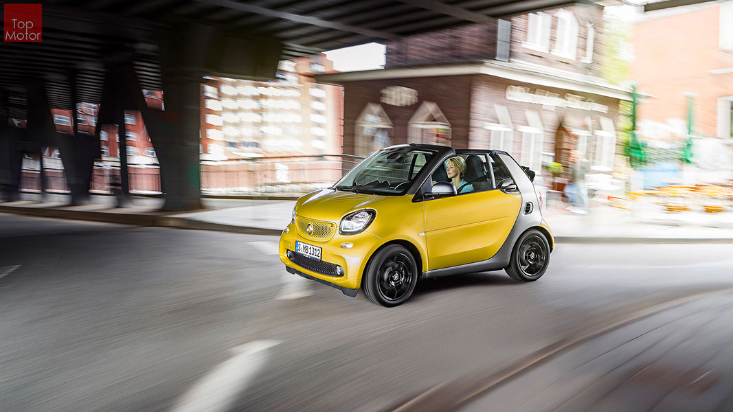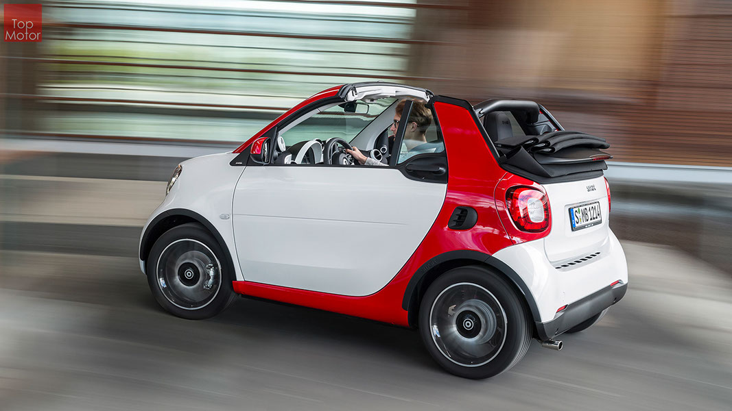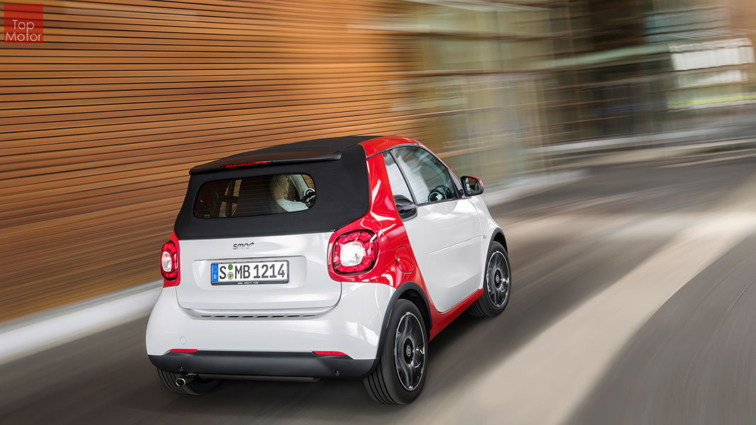 Fotos © Daimler AG Smart Fortwo Cabrio  3 em 1! Esta é provavelmente a melhor forma de descrever o novo Smart Fortwo Cabrio, pois o pequeno citadino de 2 lugares, tanto pode ser utilizado como um pequeno coupe fechado, pode apenas abrir o seu enorme tecto deslizaste ou transforma-lo num verdadeiro cabrio com a capota totalmente recolhida, podendo assim adaptar-se as diferentes condições atmosféricas ou aos diferentes estado de espírito do seu condutor. O novo Smart Cabrio é logo reconhecido como menbro da nova geração Smart, pois o se designe é em tudo igual à versão fechada, com a excepção do pilar B que é mais estreito no cabrio. São apenas necessários 12 segundos para abrir a capota "Soft Top", abertura que pode ser feita em modo totalmente automático e mesmo quando se circula à velocidade máxima, podendo também ser aberta desde o exterior do veiculo através do comando remoto. Para transformar o pequeno Smart num verdadeiro cabrio, é necessário remover manualmente as barras laterais do tecto, as quais podem depois ser guardadas num pequeno compartimento, próprio para o efeito, situado na porta da bagageira, que oferece ainda espaço adicional de arrumação, onde é possivel armazenar pequenos objectos, como por exemplo, o colete reflector, o triângulo ou o kit de primeiros socorros. A capota tem uma área total de 1.8m2, sendo que é cerca de 4% maior que a do seu antecessor, e é composta por 3 camadas. Uma camada exterior de tecido poliacrilico, uma camada interior feita numa mistura de algodão e poliester e no meio uma camada de borracha. No total a capota tem uma espessura de 20mm e o óculo traseiro é de vidro e aquecido. A resistência torcional da carroçaria foi melhorada em cerca de 15% relativamente à versão anterior, recorrendo a diversos materiais. Comparativamente ao coupe, foi ainda reforçado em locais específicos de modo a oferecer uma maior resistência da carroçaria. Para além de uma ampla utilização de aço na parte inferior, os pilares A, foram também reforçados com a introdução de um tubo em aço no seu interior. Ao nível da segurança dos ocupantes, esta é sobretudo assegurada pela tradicional "Safety Cell" da marca, capaz de absorver grandes quantidades de energia provocada pelos impactos, e de forma a satisfazer os critérios cada vez mais exigentes das normas de segurança dos crashtest, o Smart Cabrio foi também sujeito ao teste "Roof-Drop" (queda sob o tejadilho) da Mercedes, que consiste em deixar cair o veiculo num determinado ângulo, de uma altura de 50 cm sob o tecto atingindo um dos pilares A. como auxiliares à segurança o Smart conta aida com alguns sistemas até aqui reservados a classes superiores, como o ESP de ultima geração com Crosswinds Assist (assistente de ventos laterais) e o Hill Start (assistente de arranque em subida) ambos de série, e como opcionais o alerta de colisão com o veiculo da frente ou o assistente de transposição da faixa de rodagem. Em termos de motores de inicio vão estar disponíveis duas motorizações a gasolina ambas de 3 cilindros e com 71 e 90 cv, e ambos com a opção da caixa manual de 5 velocidades ou automática de dupla embraiagem. Para além dos equipamentos base das 3 versões disponíveis, Passion; Prime e Proxy, existe um vasto leque de opcionais com vista a melhorar a segurança e o conforto. O novo Smart Cabrio promete assim proporcionar o verdadeiro Joie de Vivre aos seus utilizadores.